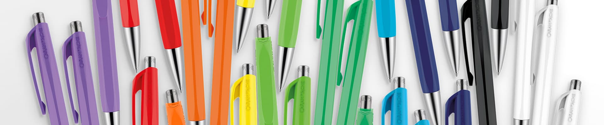 Schaft und Clip aus robustem und dauerhaftem Plastik, Spitze und Knopf aus Metall. In der Schweiz in den Genfer Werkstätten von Caran d’Ache hergestellt.