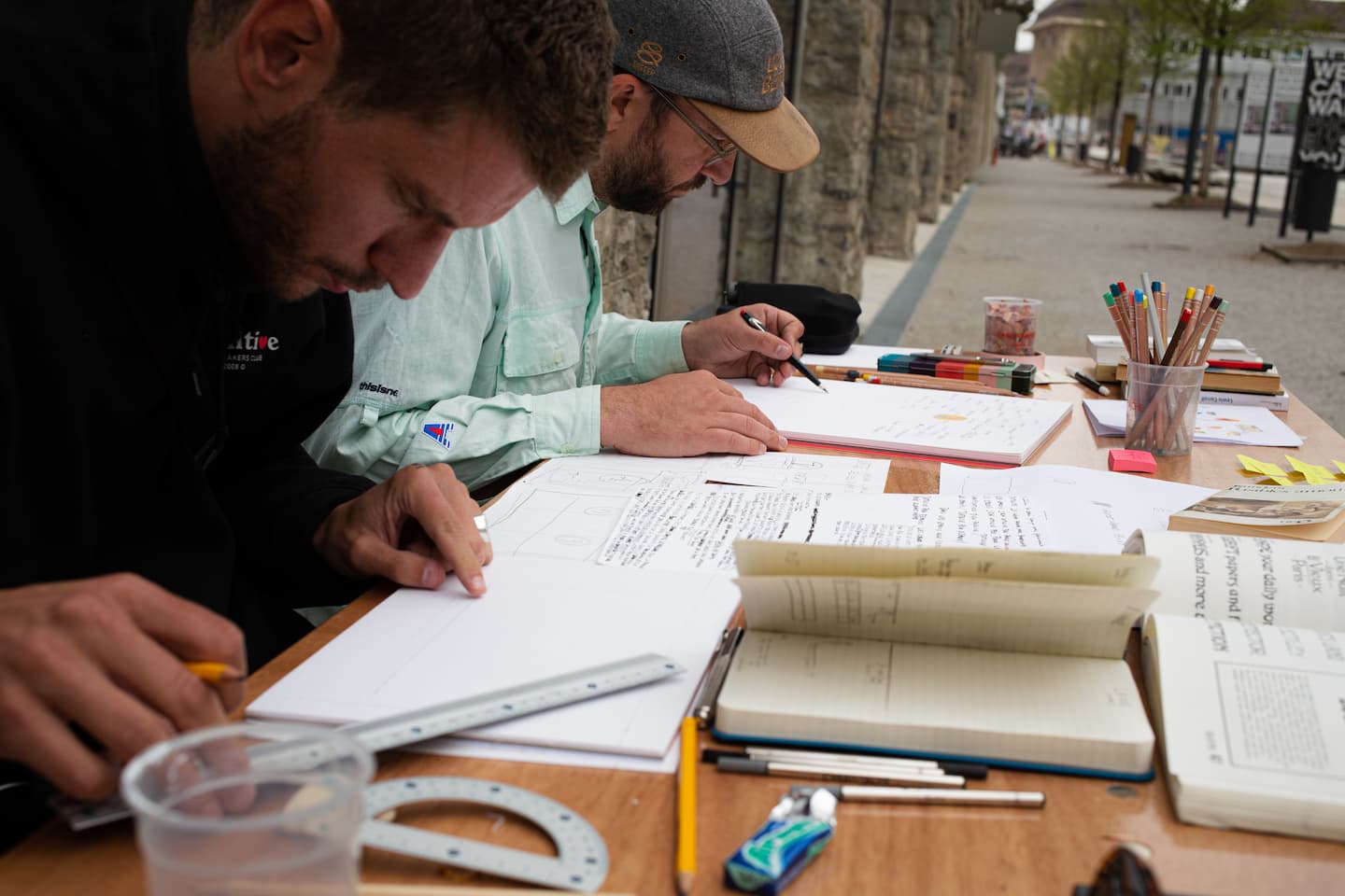 Der Schriftsteller Jon Monnard und der Illustrator Fichtre stellen im Kreativraum von Caran d’Ache im Herzen der Plateforme 10 in Lausanne aus.