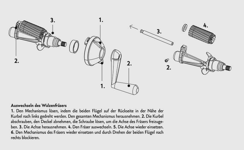 6. Setzen Sie den Mechanismus der Fräse wieder in der richtigen Reihenfolge ein und fixieren Sie ihn, indem Sie die beiden Flügel nach rechts drehen.