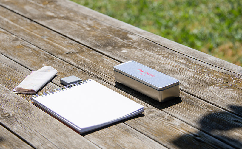 To draw outdoors unencumbered, a compact, well-curated sketching set is key: watercolour pencils plus a water brush, graphite pencil, sketchbook, eraser, and sharpener, and you’re set. Caran d’Ache offers a selection of essential drawing supplies — minimalist, yet complete — for sketching and painting wherever inspiration strikes.