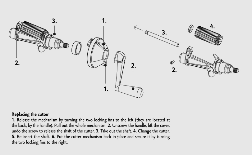 2. Remove the entire mechanism: unscrew the handle, remove the cover and then unscrew the screw using a cross head (Phillips) screwdriver to release the cutter shaft.