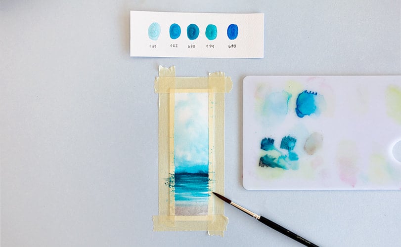 • Apply the colours in wide horizontal strokes and use the paintbrush to blend and mix the colours, which will create waves and an impression of movement in the water.
