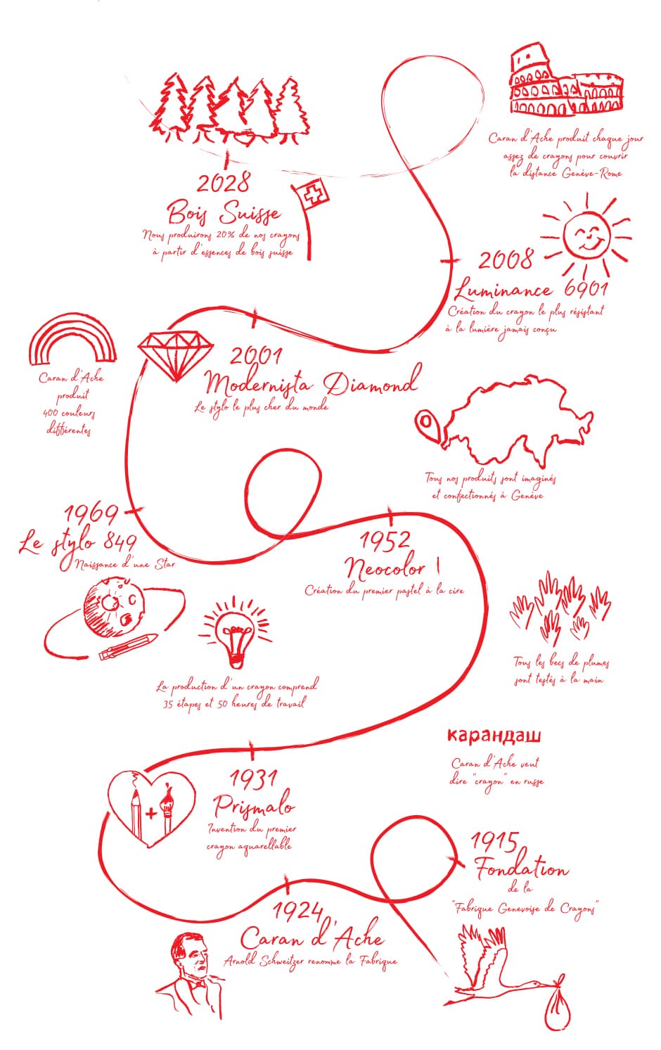 Depuis sa fondation à Genève en 1915, Caran d’Ache mêle les fils de son histoire à ceux de la créativité et de l’émotion. Artistes en herbe, amateurs et professionnels, on ne compte plus aujourd’hui les générations qui ont partagé et partagent encore la même passion pour ses couleurs et la qualité de ses instruments de dessin et d’écriture.