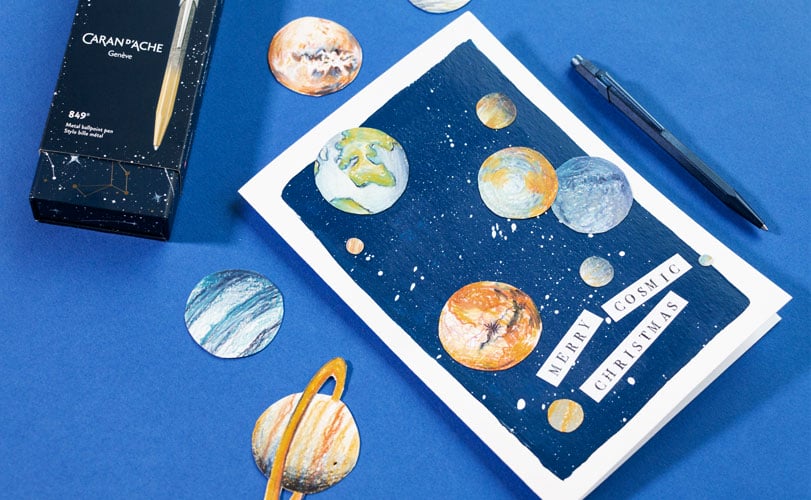 Créez une carte de vœux pas-à-pas pour souhaiter un Noël cosmique à vos proches. Au programme de ce DIY : ciel étoilé et planètes scintillantes.