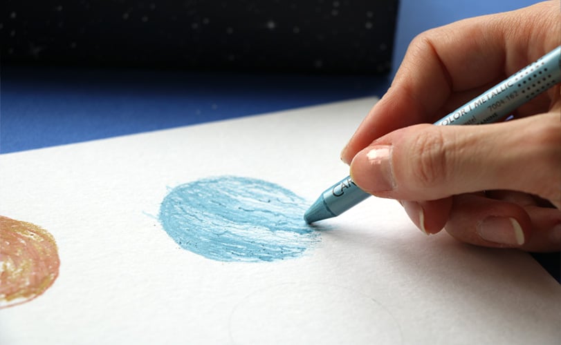 4. À l’aide de votre imagination ou d’images de références, ajoutez des couleurs à vos planètes grâce aux crayons et pastels Neocolor™ I métallisés de la collection Cosmic blue.