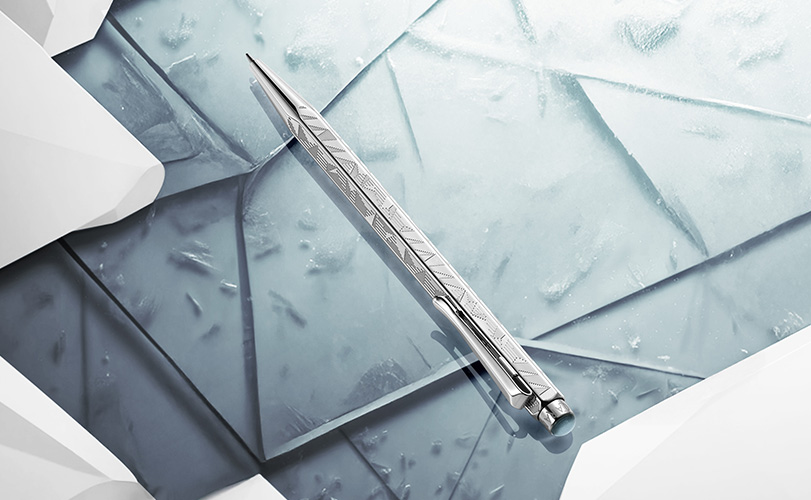 With Alpine Frost, the 849™ ballpoint pens have been reimagined in two polar variations. The first comes in iridescent glacier blue with tone-on-tone details. The second in pearly white, embellished with delicate geometric motifs and nickel-plated steel details. After that, it’s time to decide whether you’d prefer fine or medium writing, thanks to our Goliath ink refills.