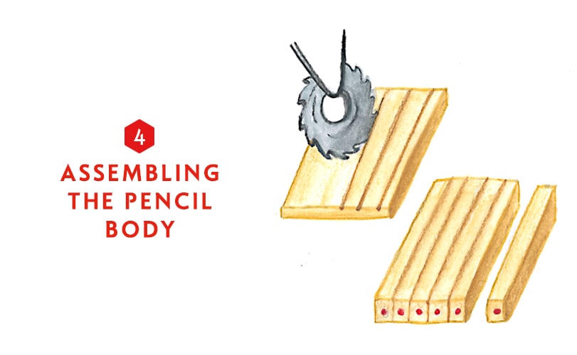 Wood arrives at the factory in planks that have to be planed and grooved. Glue is then applied to the grooved boards so that they can receive the leads. A second grooved board is then glued on top of the first to create a lead ‘sandwich’. The sandwiches are then pressed together to achieve optimum bonding before being cut into pencils.