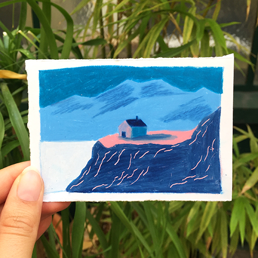 Apprenez à construire un paysage étape par étape : recherche de couleurs, croquis, composition puis réalisation finale.