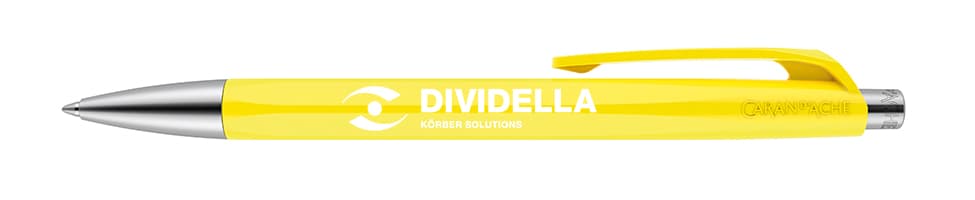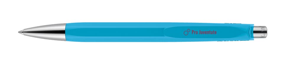 Plastique résistant et durable, pointe et bouton en métal. Fabriqué en Suisse dans les ateliers genevois de Caran d’Ache.