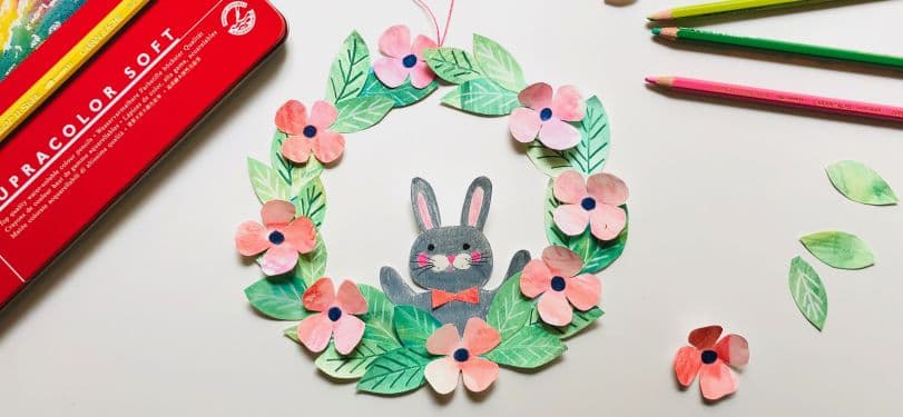 “Per questa creazione ho scelto una gamma di verdi per le foglie: verde abete, verde prato, oliva chiaro e bianco per le nervature. Verdi allegri e freschi che ci ricordano subito i giovani germogli. Per i fiori ho scelto il rosa e lo scarlatto per i petali e, per creare un centro a contrasto, un blu di Prussia. Per il coniglietto ho usat il grigio, il nero e il rosa.”