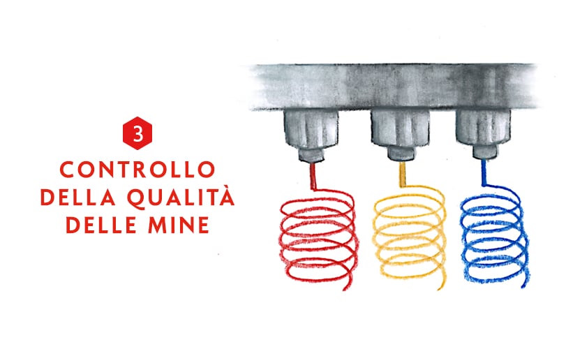 L’impasto destinato alla produzione delle mine di matite è poi compresso ed estruso. Questa fase corrisponde alla “filatura” delle mine. L’impasto viene estruso dalla trafila, pezzo metallico bucato attraverso il quale esce uno “spaghetto” continuo dal diametro desiderato. Esistono infatti delle mine con diametri vari (per esempio la punta della matita Prismalo è più sottile di quella di una matita Luminance). Lo spaghetto così creato è immediatamente tagliato alla lunghezza della matita, poi essiccato a più di 100° C. Dopo l’essiccazione e il raffreddamento, le mine sono rimesse in cesti ed immerse per 24 ore in un bagno di cera fusa. Ma prima, un controllo di qualità è di rigore !