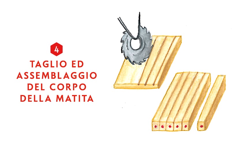 Il legno di cedro certificato FSC arriva nella fabbrica sotto forma di tavolette che bisogna piallare e fresare per creare delle scanalature. Queste scanalature sono poi incollate e pronte a ricevere le mine. Una seconda tavoletta scanalata e incollata ricopre poi la prima per creare un “sandwich”. Questo viene pressato per un assemblaggio perfetto, prima di essere tagliato per ottenere diverse matite. In questa fase del processo le matite sono ancora grezze, dal colore del legno.