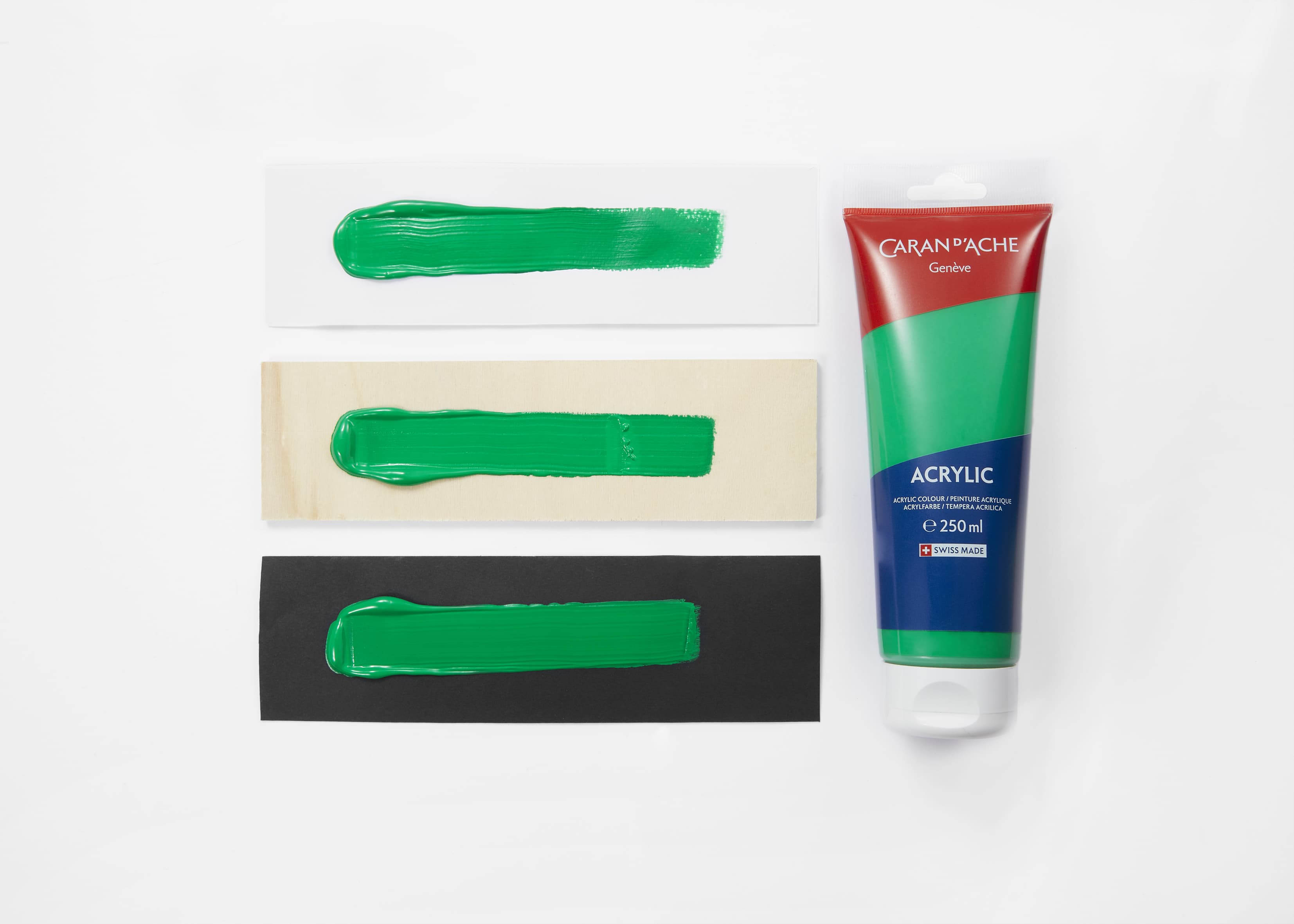 Das glänzende, seidenmatte Erscheinungsbild nach dem Trocknen ist typisch für Acrylfarbe. Generell wird sie mit Wasser verwendet, man kann die Farbe jedoch auch mit spezifischem „Medium“ nutzen, das man in Geschäften für Malereibedarf findet.