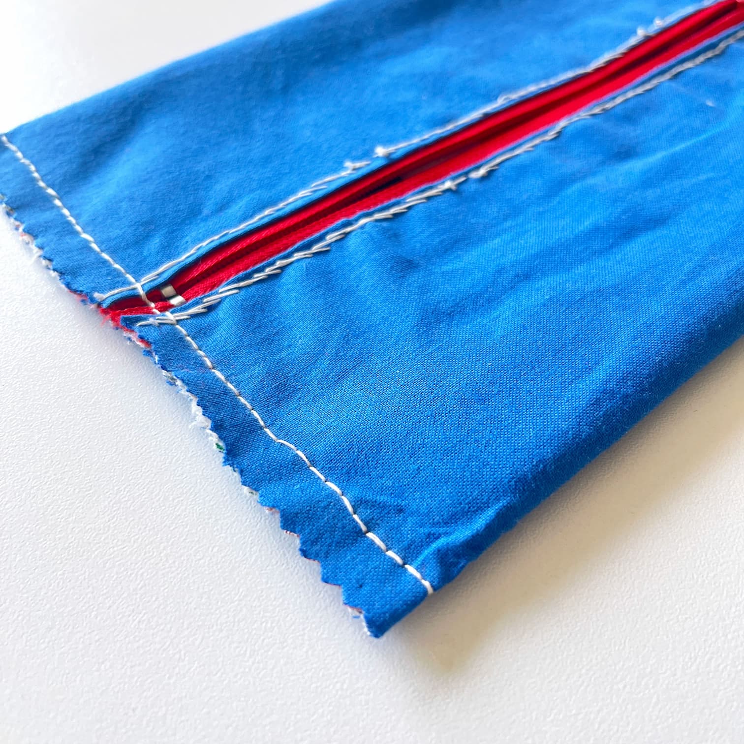 Nun müssen noch die linke und die rechte Seite der Federmappe genäht werden. Drehen Sie die Tasche auf die Innenseite und vernähen Sie die Enden hinter dem Reißverschluss.