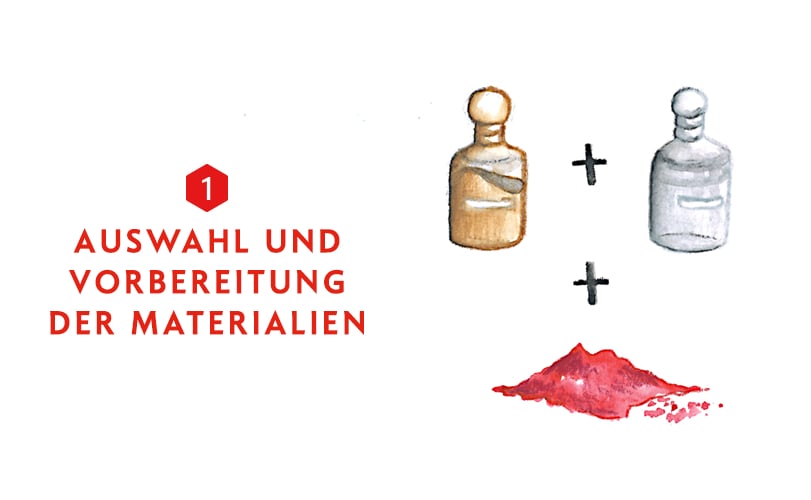 Jede Buntstiftmine besteht aus Pigmenten, Farbmasse, weißen Füllstoffen und Bindemitteln. Bei der Vorbereitung werden die Pulver und Bindemittel zunächst mit Wasser verdünnt und unter Berücksichtigung präziser Dosierungen miteinander vermischt. Je nach Farbe muss des Weiteren ein unterschiedlicher Feuchtigkeitsgehalt berücksichtigt werden. Im Anschluss wird das Ganze zermahlen.