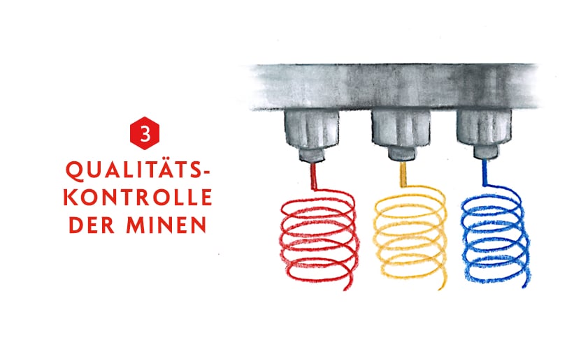 Nachdem die Minen in das Wachsbad getaucht wurden, nimmt das Prüflabor verschiedene Qualitätskontrollen vor. So werden die Stifte insbesondere bezüglich Bruch und Verschleiß geprüft.