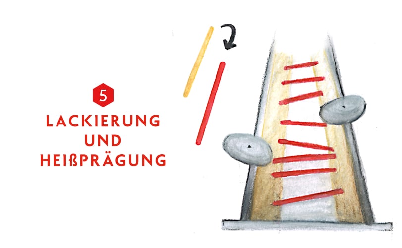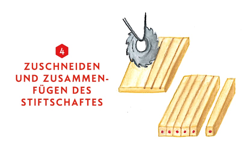 Das Zedernholz mit FSC-Label erreicht die Manufaktur in Form von Brettchen. Diese müssen geschliffen und genutet werden, um Rillen zu erzeugen. Diese Rillen werden später mit Klebestoff bestrichen, damit die Minen eingefügt werden können. Ein zweites geschliffenes Brettchen wird dann sandwichartig auf das untere Holzstück gelegt. Danach wird das Ganze gepresst, um einen optimalen Halt zu erzielen, bevor aus den beiden Brettchen schließlich mehrere Stifte geschnitten werden. In diesem Stadium des Herstellungsprozesses sind die Stifte noch ganz natürlich in der Farbe ihres Holzes.