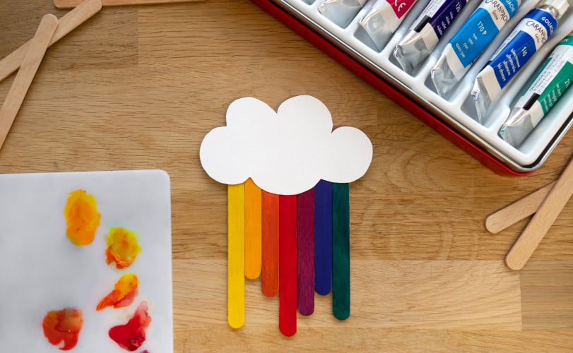 ● Faire un puzzle à reconstituer pour les plus jeunes enfants avec des bâtonnets de glace en bois (un arc-en-ciel, des fleurs,...).