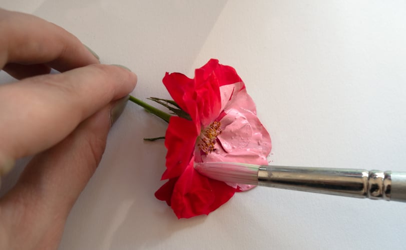 ● Sur un carton, appliquez de la peinture avec un pinceau sur vos fleurs. Ensuite, posez délicatement la fleur sur une feuille de papier. Recouvrez d’une seconde feuille et appuyez légèrement sur la fleur pour que la peinture se transfère correctement. Vous n’avez plus qu’à soulever la feuille de papier et retirer la fleur. Vous pouvez recommencer l’opération avec plusieurs fleurs.