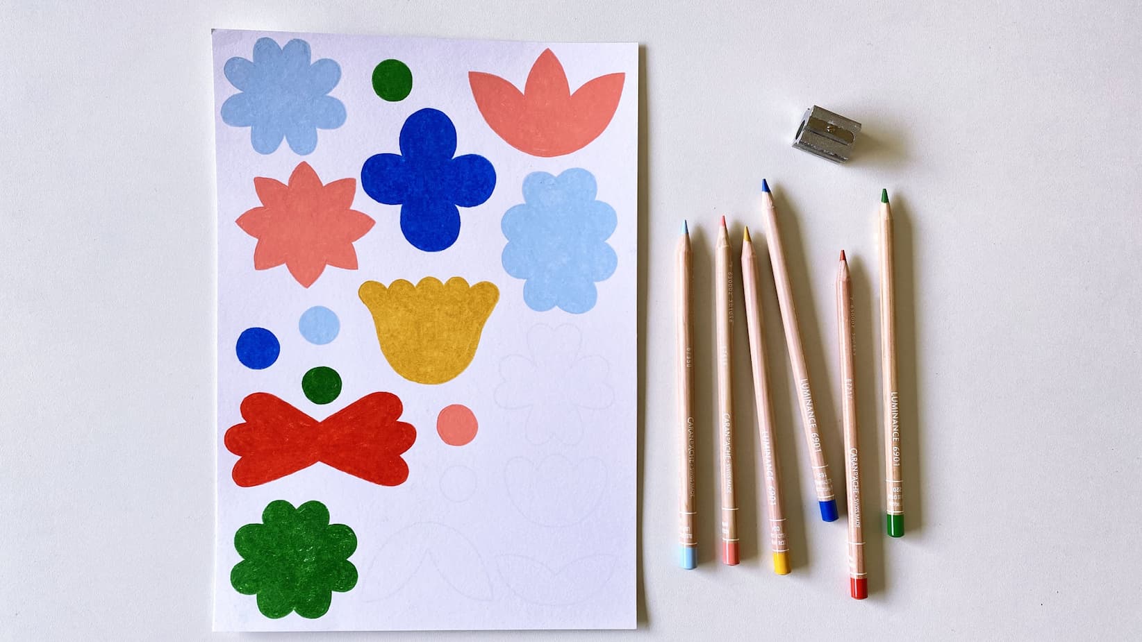 Coloriez les formes de fleurs à votre guise (les cernés gris clair sont là pour vous guider, ils disparaissent sous le crayon de couleur). Elles peuvent être monochromes ou multicolores, amusez-vous ! Régulièrement, passez délicatement un coup de chiffon microfibre sur votre dessin pour éviter les poussières de crayon.