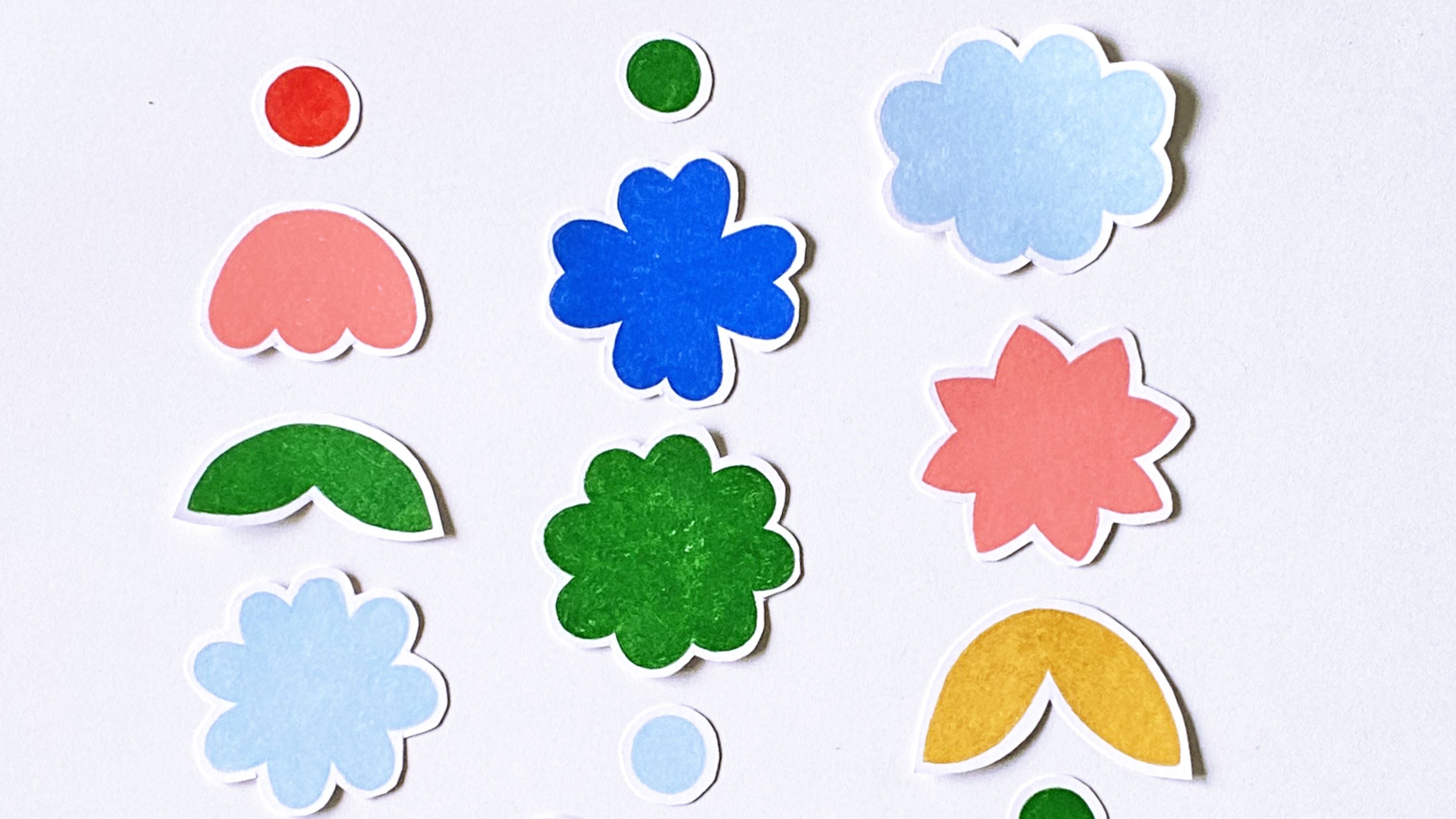 Une fois les formes de fleurs coloriées, vous pouvez les découper en veillant à laisser un contour blanc de quelques millimètres. Puis vous pouvez colorier le verso.