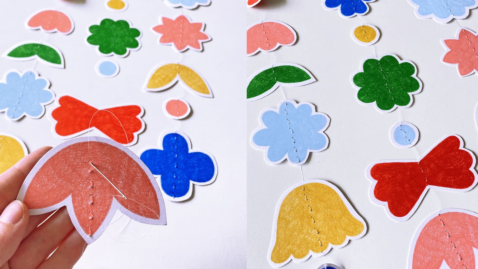 Lorsque vous êtes satisfait.e de votre composition, cousez les formes les unes avec les autres en commençant par le bas de chaque guirlande. Avec une aiguille et un fil de nylon d’environ 50 cm, réalisez des points avant d’environ 5mm et espacez les formes d’environ 2cm. Laissez un bout de fil plus grand en haut (environ 15 - 20cm) en prévision de l’assemblage final du mobile.