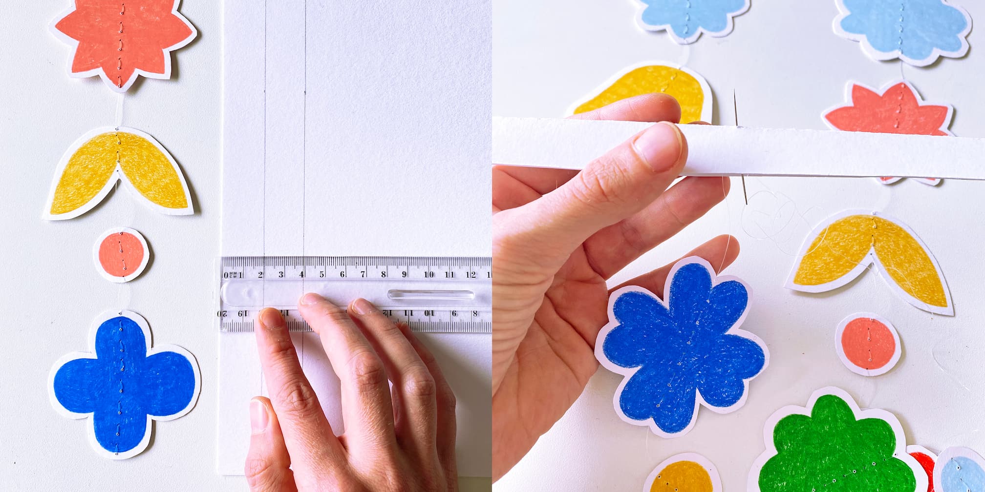 Dans une autre feuille de papier 250g, découpez une bande de 4 x 29,7 cm. Tracez une ligne au centre (à 2 cm). Marquez le pli central (à l’aide d’un stylo qui ne marche plus par exemple) puis cousez les guirlandes au support en piquant les fils dans la pliure.
