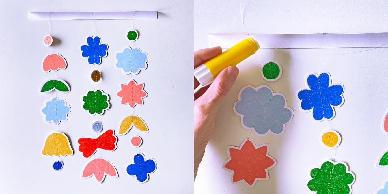 Faites passer un nouveau fil de nylon dans la bande de papier de sorte à suspendre le mobile (en formant un triangle). Puis fermez la bande avec de la colle.