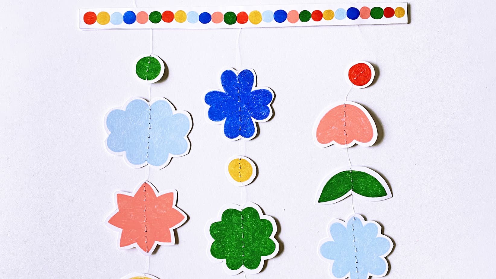 Jouez avec les formes pour composer les 3 petites guirlandes. Veillez à répartir les formes uniformément pour équilibrer le mobile. Si l’une de vos guirlandes est plus longue que les autres, placez celle-ci au milieu.