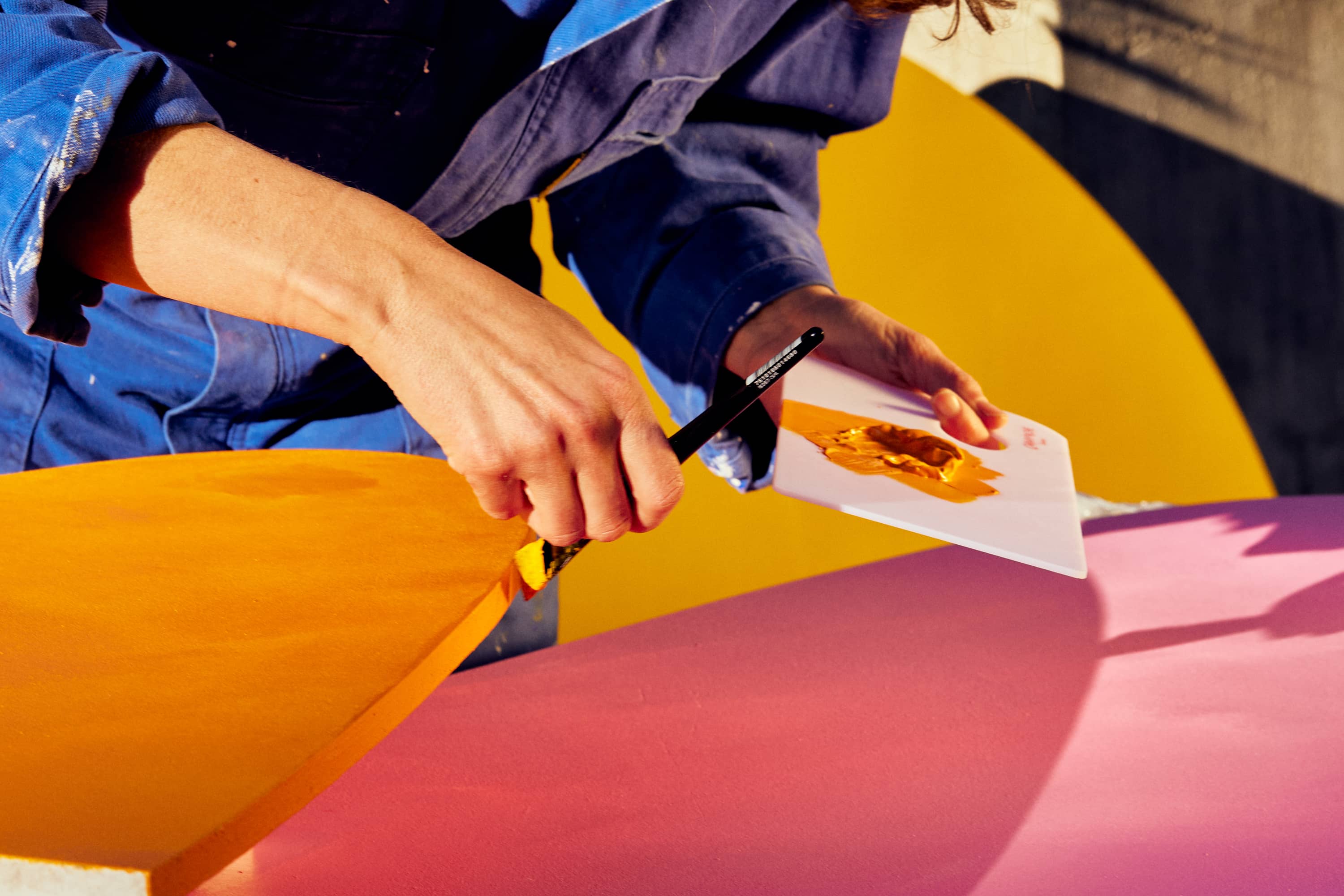 An ingenious system of modular panels in cut wood provides volume, encouraging people not to step inside but to enter this magnified and dreamlike scenery with their eyes. It is the opportunity to ramble through this poetic, dreamlike countryside… and to open the paths of the eyes. The artist created this installation with the acrylic paint range from Caran d’Ache.