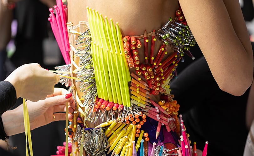 Swiss designer Kévin Germanier unveils an upcycled piece made from Caran d’Ache products in his Haute Couture show in Paris.