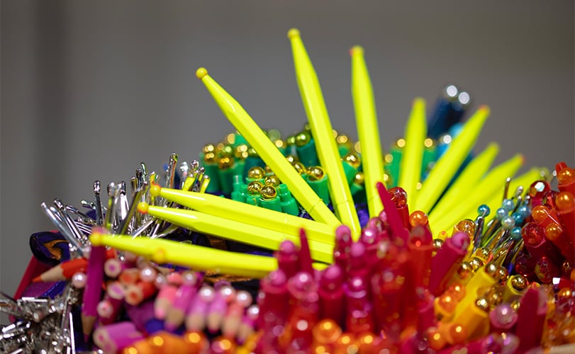 For this collaboration with Caran d’Ache, what I really wanted to do was a true celebration of colour, a pure explosion. I wanted to transform the Caran d’Ache products collected to the point where they were unrecognizable during the show. With my team, we reinvented them, shaped them, until they were transformed into beads and small rings," shared the designer after the show.