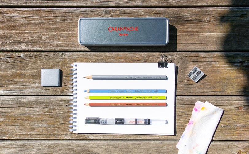 To draw outdoors unencumbered, a compact, well-curated sketching set is key: watercolour pencils plus a water brush, graphite pencil, sketchbook, eraser, and sharpener, and you’re set. Caran d’Ache offers a selection of essential drawing supplies — minimalist, yet complete — for sketching and painting wherever inspiration strikes.