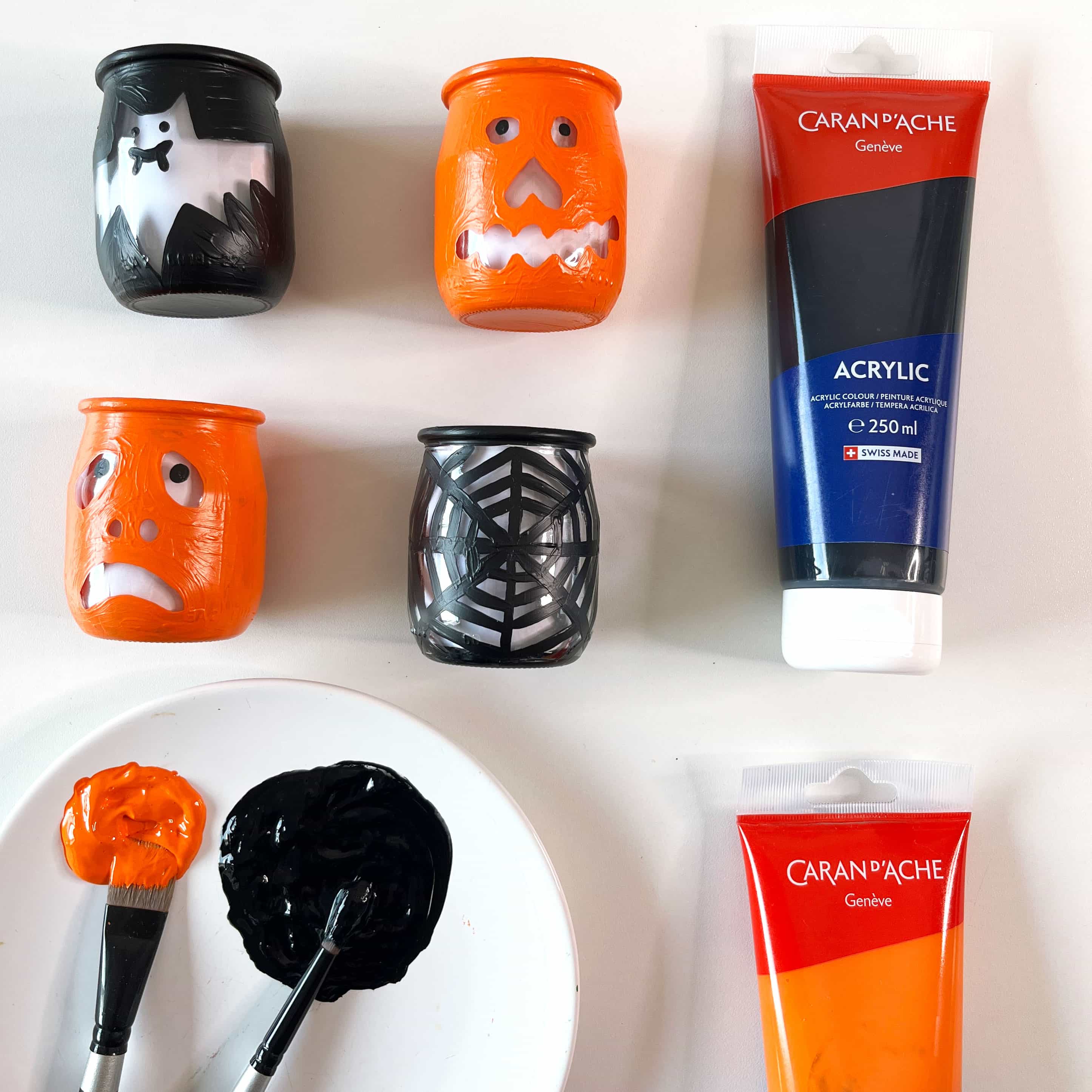 Taglia un pezzo di carta della misura del tuo vasetto e disegnaci un viso di zucca, un pipistrello o una ragnatela con un pennarello nero Fibralo.