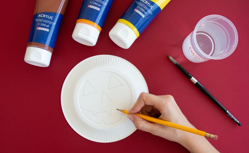 Con la matite di grafite, disegna gli occhi, il naso e la bocca della zucca sul lato esterno del piatto.