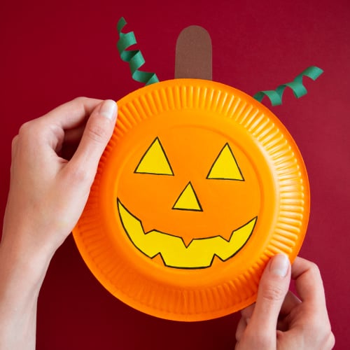 Per realizzare il gambo della zucca, dipingi di marrone un bastoncino di legno e incollalo sul retro del piatto. Infine aggiungi qualche pezzo di filo di ciniglia verde per creare i fogli della zucca.