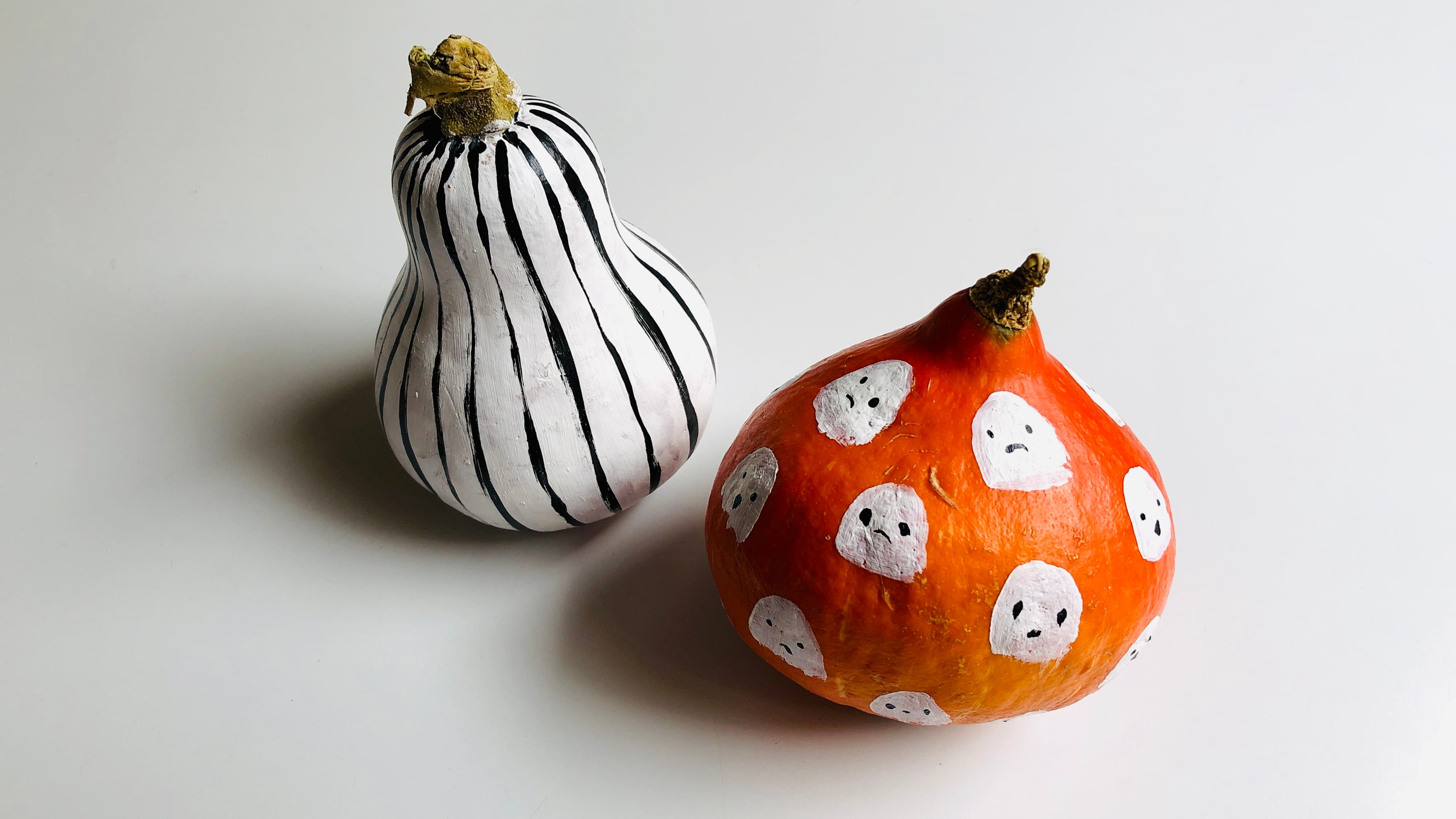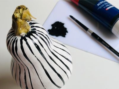 Se hai una zucca butternut, dopo averla ricoperta di un primo strato di Acrylic bianca, dipingi delle strisce o un altro motivo in nero per un’atmosfera festiva perfetta!