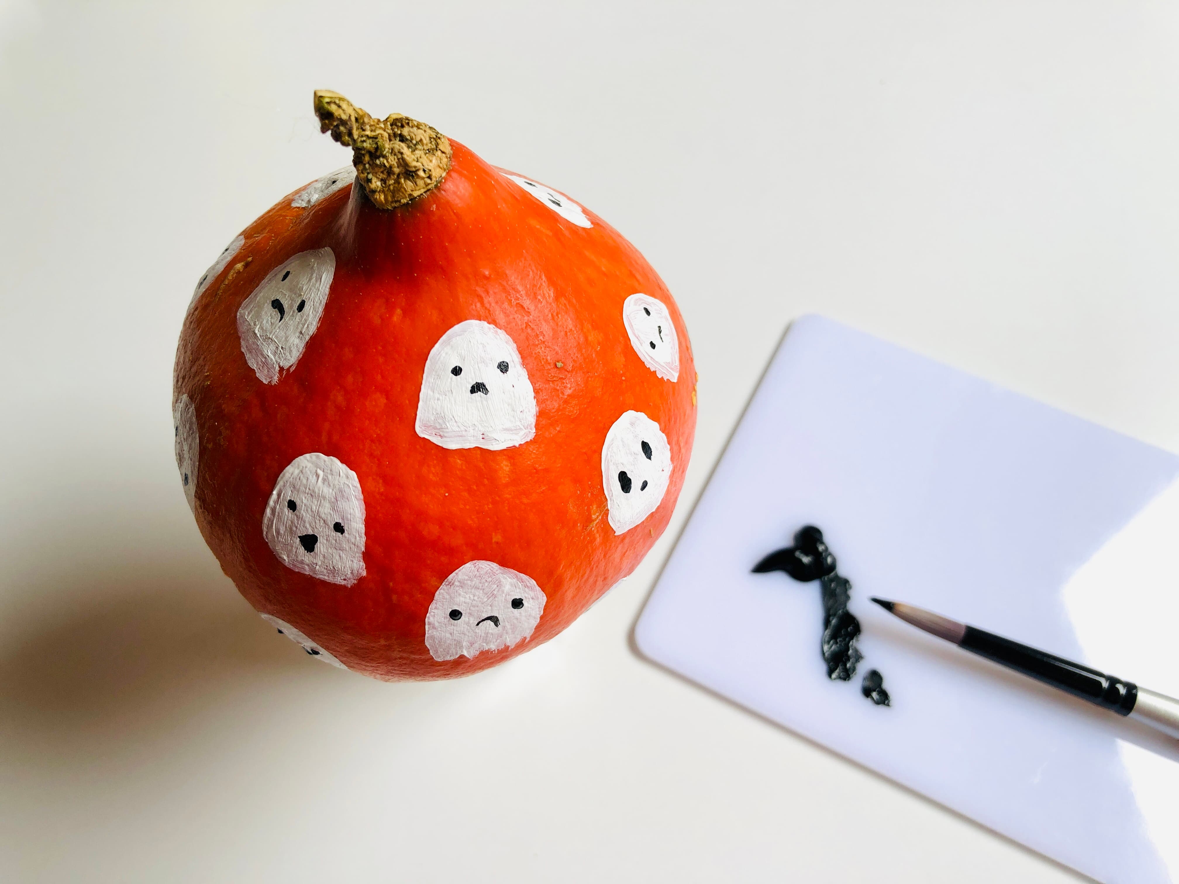 Per la zucca con i fantasmi, applica un po’ di pittura Acrylic nera (o di qualsiasi altro colore) sul lato liscio della tavolozza. Con il pennello Acrilico Punta Arrotondata n. 10, disegna occhi e bocca.