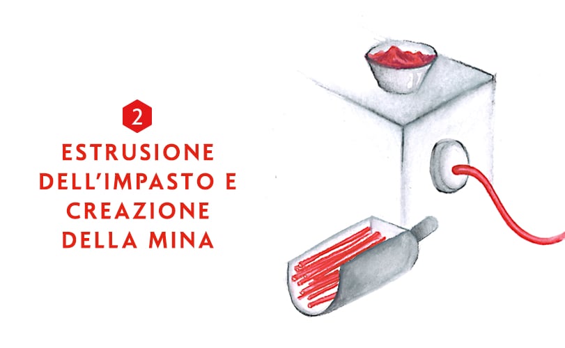 Ogni punta di matita è composta da pigmenti, materia colorata, carica bianca e leganti. Durante la preparazione, polveri e leganti previamente diluiti in acqua vengono mescolati con dosaggi precisi, e soprattutto con un tenore di umidità diverso a seconda del colore, poi macinati.