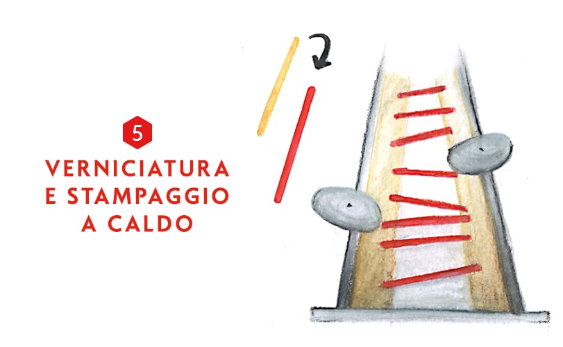 Le matite verniciate sono poi sottoposte allo stampaggio a caldo su una delle tre loro facce in modo da scrivere il nome della Maison, quello del prodotto e le indicazioni essenziali quali “Swiss Made”, il numero del colore oppure il codice a barre. Infine le matite vengono tagliate da una lama o un nostro abrasivo così da ottenere il loro angolo definitivo, specifico della gamma di matite corrispondente.
