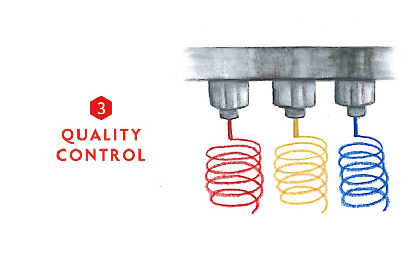 スピニング」と呼ばれるステップでは、ペーストが圧縮され、金属片の開口部から押し出されます。ペーストの“スパゲッティ”がそれぞれの太さでできあがります (たとえば、プリズマロの鉛筆の芯はルミナンスよりも細いです)。スパゲッティを鉛筆の長さに切り、100℃以上の温度で乾燥させます。冷却後、芯をバスケットに入れ、ワックスに24時間浸します。