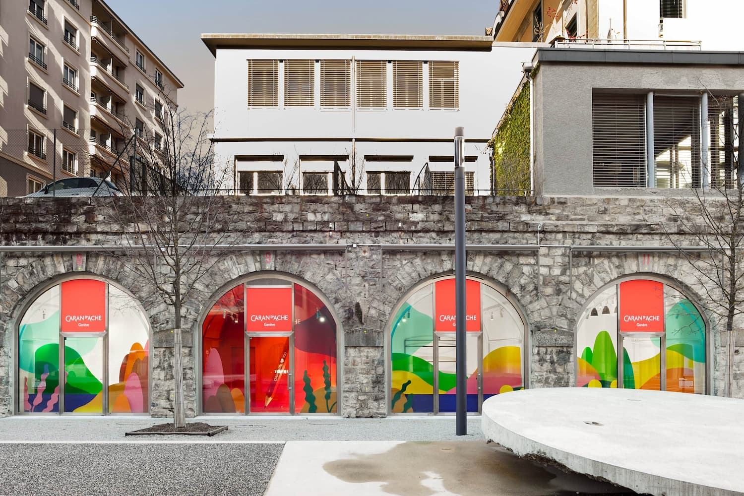 For Caran d’Ache, she has dreamt up a vision of the local lakeside scenery in delicately acidic colours, stretching the entire length of the space.